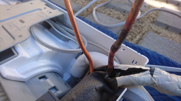 今日は中央区新築でエアコン移設工事をしました。何度か移設をしていたそうで配管が折れていました。