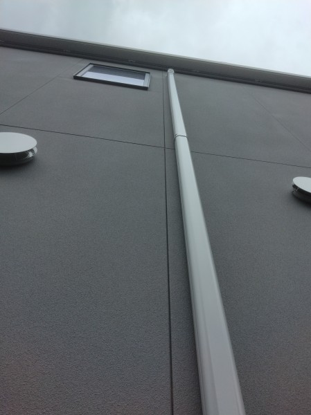 2台共立ち下げ工事でグレーの配管カバーを施工しました。ハシゴが立たなかったので隣りの敷地から工事をしました。
