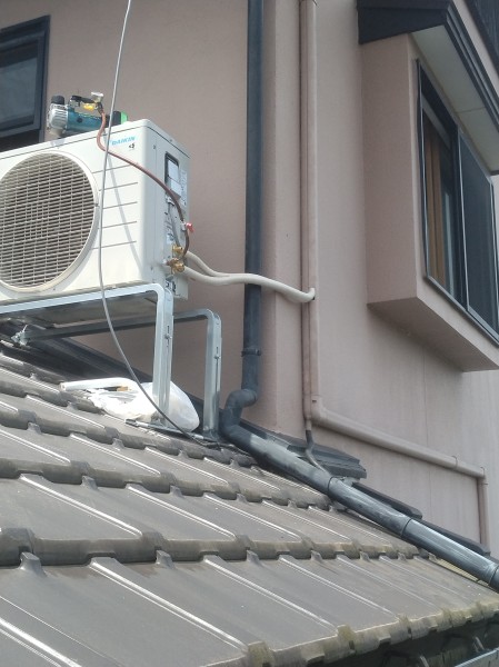 今日は朝倉市でエアコン工事をしました。リピーター様で数回目の訪問になります。いつもありがとうございます😊入れ替え工事でしたが洗濯物を干すのに屋根?を増設してあり同じように施工できず屋根置きに変更しました。