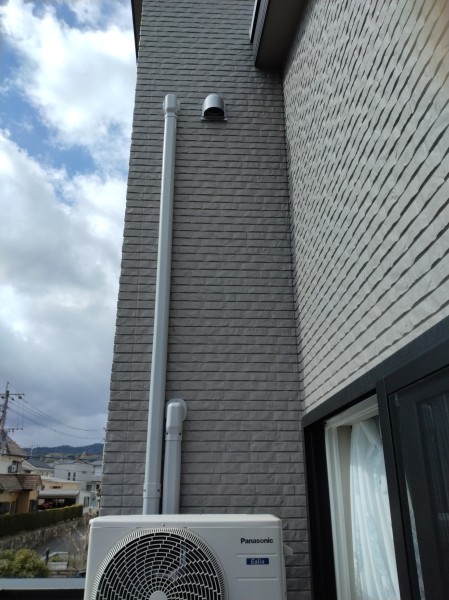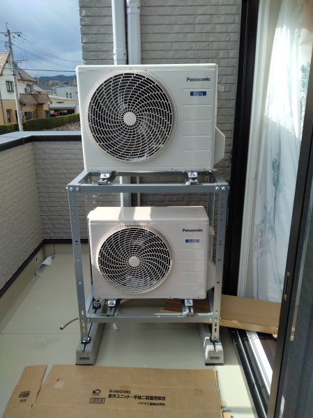 昨日と今日で鳥栖市新築🏠️戸建てでエアコン6台工事をしました。3階〜2階に立ち下げ工事1台、2階〜1階立ち下げ工事3台、2階ベランダ1台、1階地上1台でした。3階〜2階に立ち下げたエアコンと2階ベランダ施工の室外機を2段置工事しました。