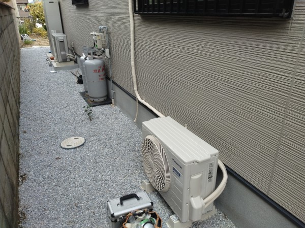 今日は福岡市東区から宗像市にエアコン移設をしました。室外機を設置する所にガスボンベがあり2m離して施工しました。配管は既存配管が足りませんでしたので無駄に追加が出ないように溶接をしました。