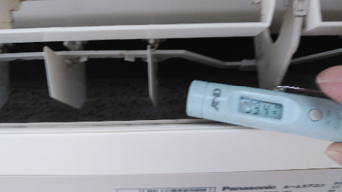 エアコン移設工事の時は必ず温度を計っています。吸い込みと吐き出しの温度差バッチリでした。